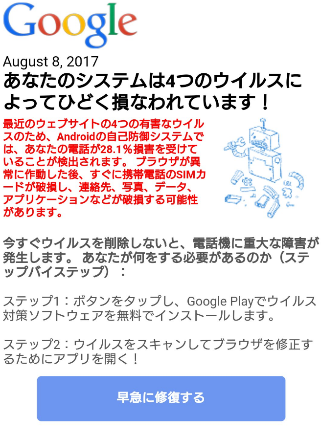 お使いのスマートフォンがウイルスに感染しました!みたいな広告たまに出るけどあれやってること詐欺やろ